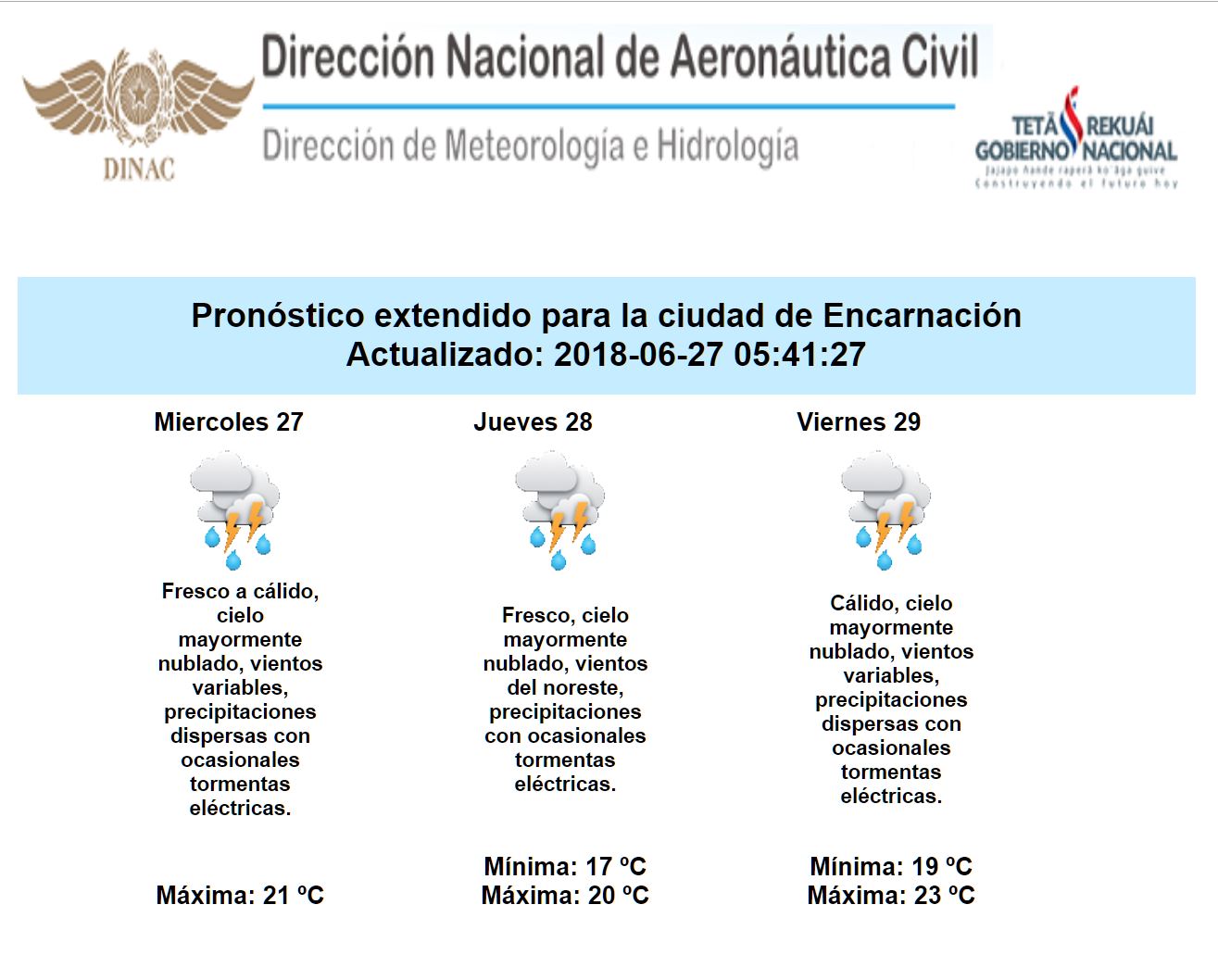 La jornada de hoy miércoles nuevamente se presenta con probabilidades de lluvias, que podrían venir acompañadas de ocasionales tormentas eléctricas de manera puntual al final de la jornada. Sin embargo, mañana jueves, las lluvias podrían ser más generalizadas, principalmente sobre el centro sur y este de la Región Oriental. Las condiciones del tiempo irían mejorando para el viernes, con probabilidades de lluvias hacia el sur del país.