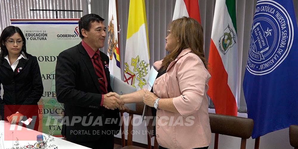 Durante este viernes, en la sala del Consejo Superior de la Universidad Católica Campus de Itapúa (UCI), se desarrolló la importante firma de Convenio entre dicha casa de estudios superiores representada por su Directora General la Mgter. Rosa Encina y la Coordinación Departamental de Educación, al frente del Lic. Celso Ramírez.