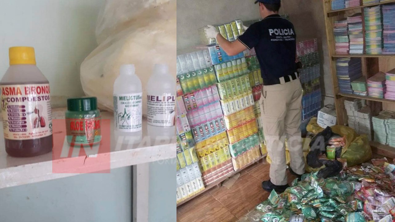El lugar, según intervinientes, funcionaba como una fábrica clandestina de remedios naturales donde se encontraron 100 cajas de medicamentos naturales “Adelgazante”, 50 frascos de jarabes, 300 cajas de medicamentos naturales “úlceras y gastritis”, 100 cajas de medicamentos naturales “Apendicitis”, 1.000 frascos vacíos e impresiones varias a ser colocadas por los frascos de cada producto.