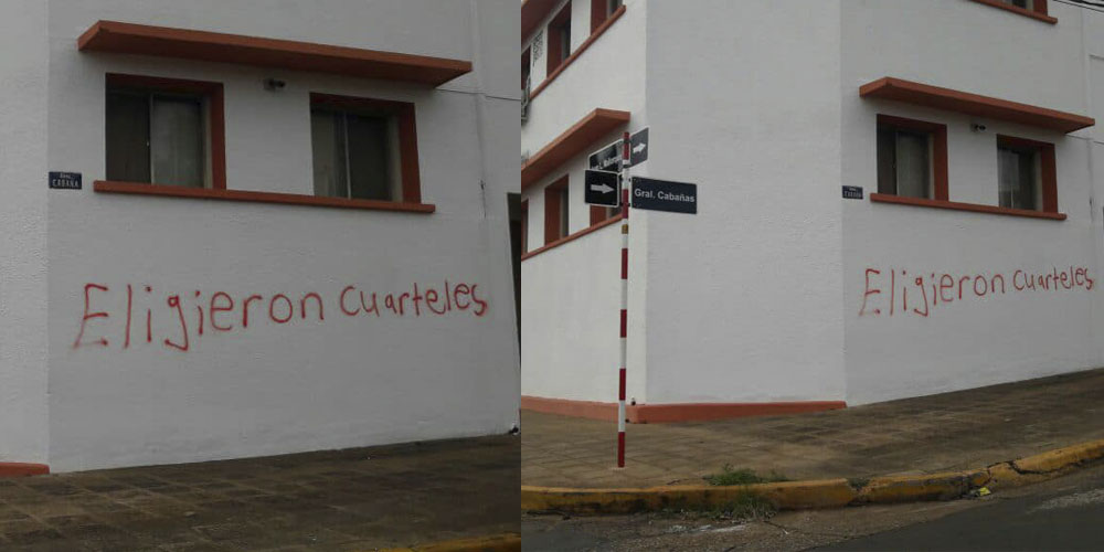Esta vez, la víctima fue la sede de la Diócesis de Encarnación, donde podemos observar la frase “Escogieron Cuarteles”, en alusión a una de las propuestas del Presidente de la República recientemente electo Mario Abdo, quien habría prometido la reactivación del Servicio Militar Obligatorio.